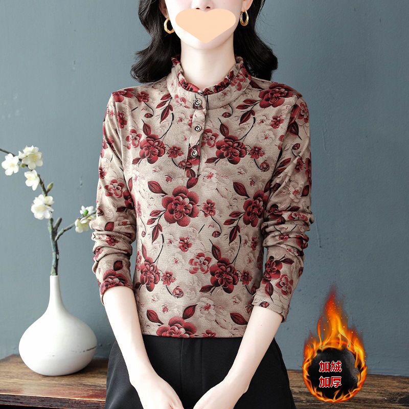 加厚加絨新款媽媽高檔木耳領提花打底中年長袖立領小衫保暖上衣