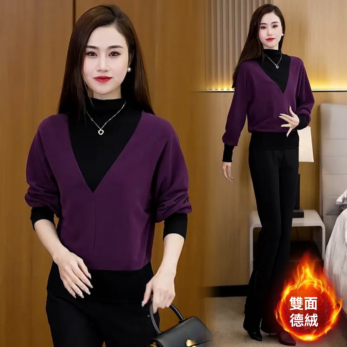 德絨暖感暴擊!假兩件高領打底,一件抵兩件! 高領鎖溫護頸,拼接設計自帶層次感,不用疊穿也時髦~ 親膚柔軟,遮肉藏腰腹,一件穿遍秋冬!